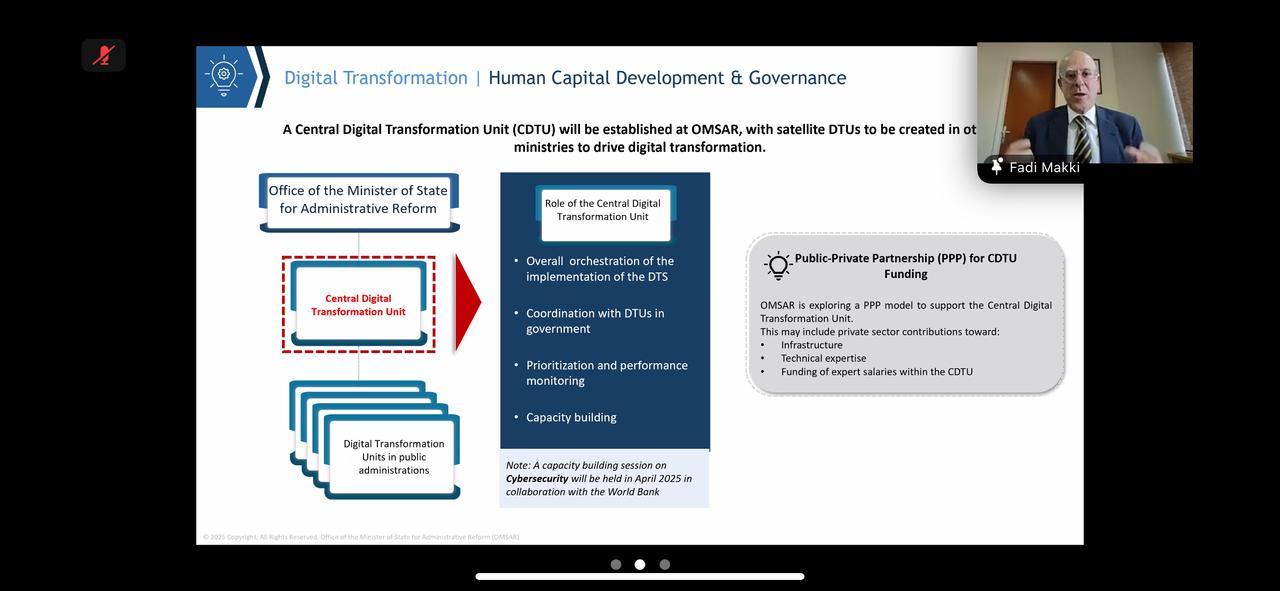 وقد حدد الدكتور مكي المراحل المتوقعة للتنفيذ مع الجدول الزمني لها. كما تطرق الحديث حول رؤيته لوحدة التحوّل الرقمي في الوزارة والتي من شأنها التنسيق مع الوحدات الأخرى، وبالتالي دورها في خلق فرص الشراكة بين القطاع العام والقطاع الخاص للإستفادة من خبرات اللبنانيين المقيمين والمغتربين في مجالات التكنولوجيا، الابتكار والأمن السيبراني وغيرها من الأمور وبالأخص آلية التعيينات في وظائف الفئة الأولى التي تعمل عليها الوزارة.